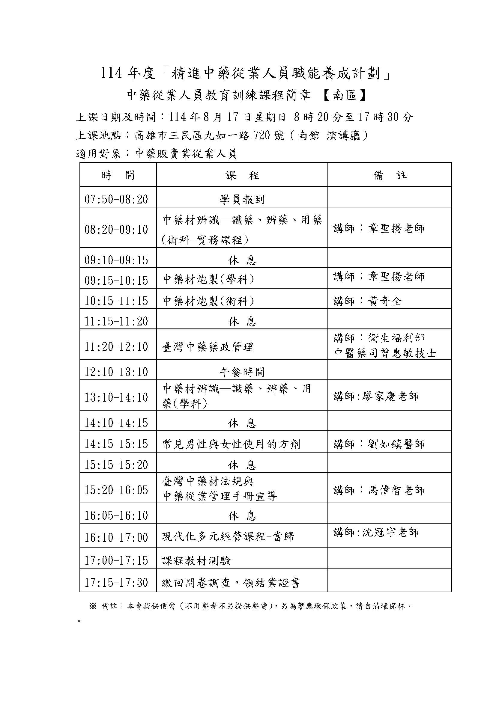 114年度「精進中藥從業人員職能養成計畫」南區課程資訊及名單 南區接駁車時間: ※如有颱風本會依政府政策辦理,擇期舉辦,公告依本會官網宣布或洽各縣市中藥商業同業公會總幹事。 如有不便敬請見諒! 左營高鐵站遊覽接駁點! 接駁時間 07:40 請各學員從高鐵的2號出口,搭手扶梯到1樓 搭車位置於彩虹市集門口的車道 文件下載: 南區上課學員名單